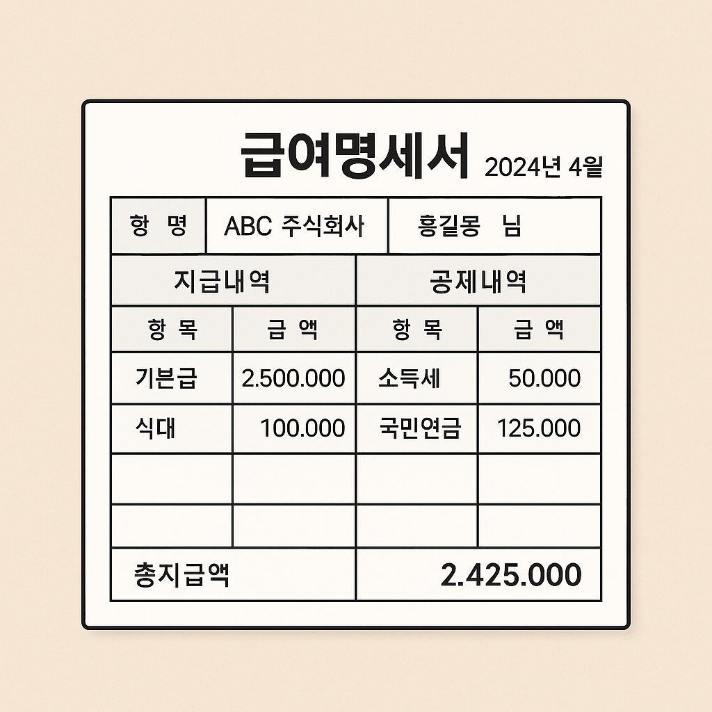 급여명세서는 사용자가 근로를 제공한 대가로 받은 임금에 대한 세부 내역을 기록한 공식 문서입니다. 지급 항목과 공제 항목이 모두 포함되어 있으며, 실지급액이 어떻게 산출되었는지를 확인할 수 있습니다.