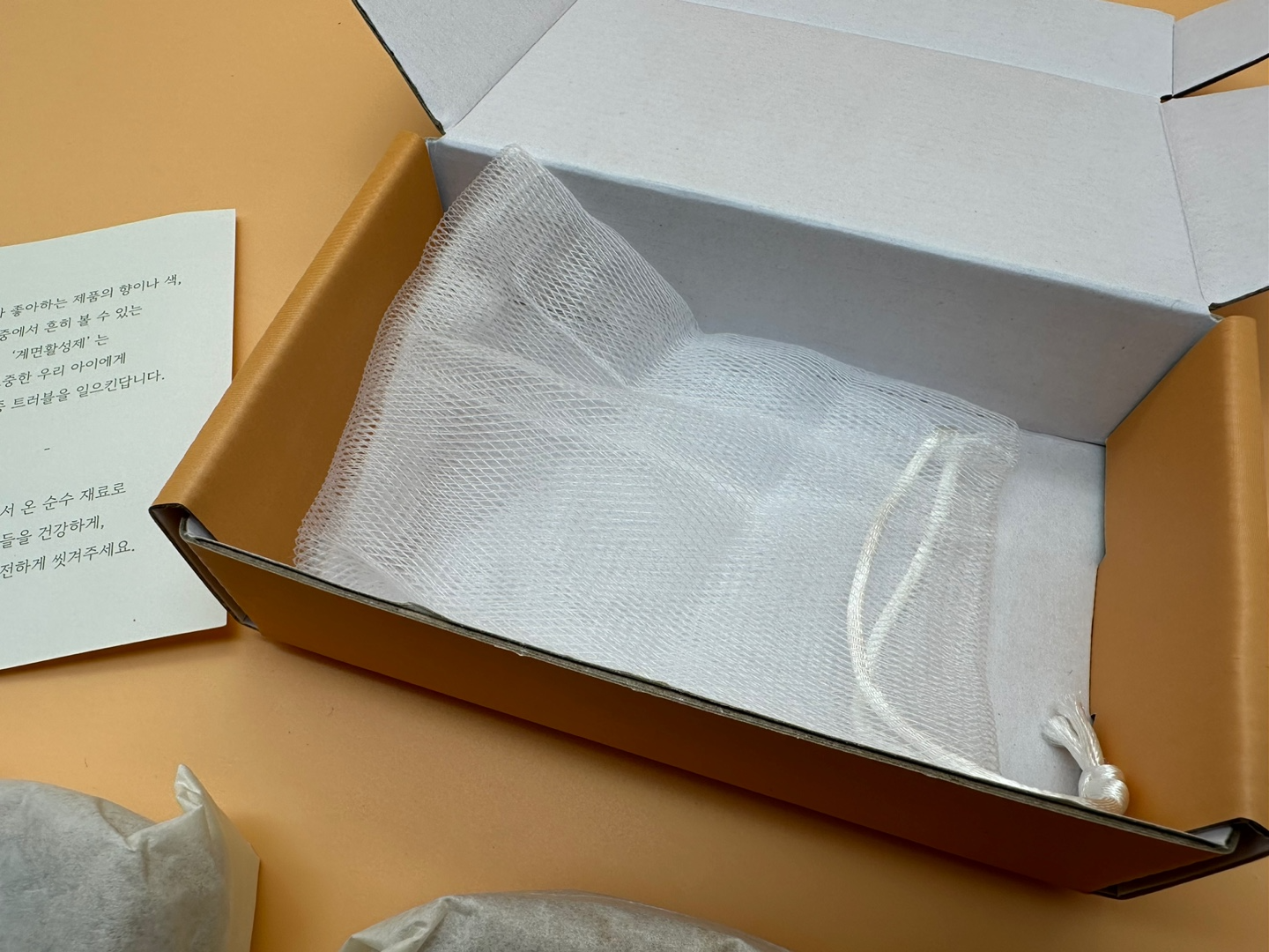 제품 구성은 2개입 샴푸바 + 전용 거품망이에요. 망에 샴푸바를 넣고 물에 적신 뒤 조물조물 문질러주면, 뽕실뽕실한 거품이 금세 완성돼요. 쫀쫀하고 미세한 거품이라 아이 피부에 자극 없이 사용할 수 있고, 향도 자극적이지 않아 편안했어요.