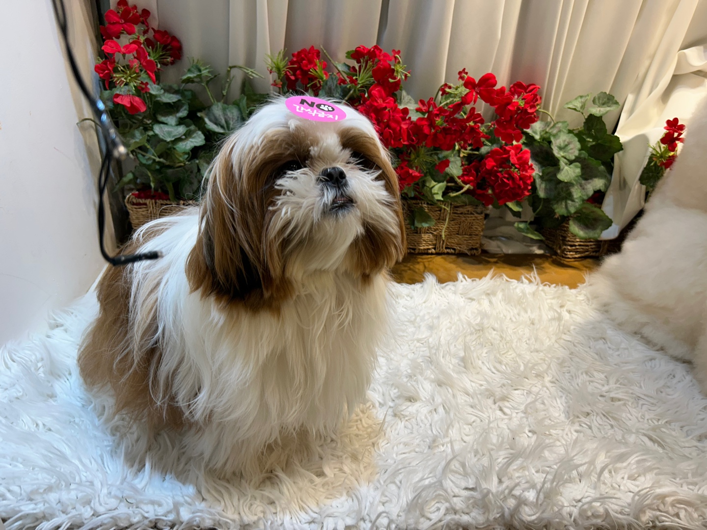 사진 찍는 불혹 아줌마와 슈슈 옆에 쪼그리고 앉아있는 이 귀요미 친구! 이마에 붙어있는 스티커를 보고 얼마나 웃었는지 몰라요. "간식 금지"라니... 간식을 못 먹는 이 친구는 짠하지만, 이 모든 게 너의 건강을 위한 거니까 참아야지!