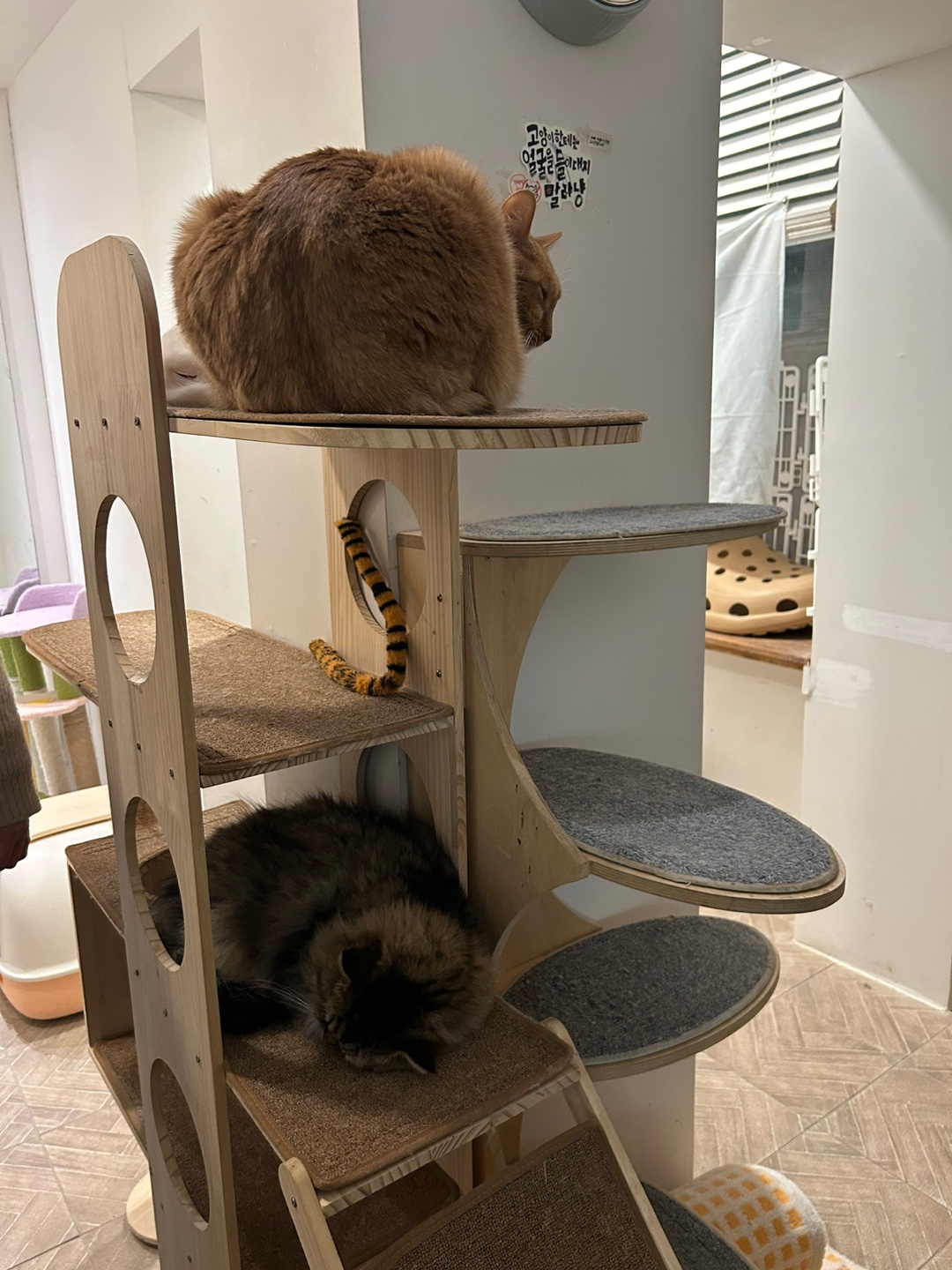 고양이방에는 총 다섯 마리의 영희씨들이 있었어요. 많이 놀아서 고단했는지 모두 자리에 앉아 휴식을 취하고 있는 모습이었습니다. 고양이 친구들의 휴식 시간을 방해하지 않기 위해 살짝 구경만 하고 얼른 나왔답니다.