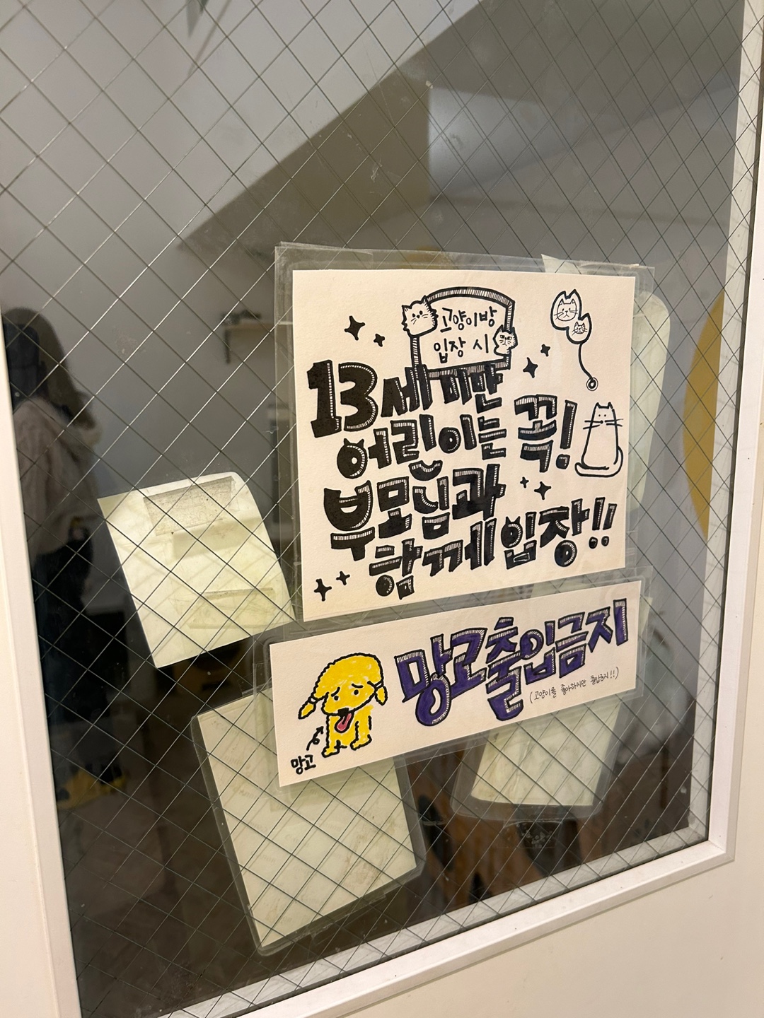 더귀여워 애견카페 고양이방에 들어갈 때는 13세 미만 어린이는 꼭 부모님과 함께 입장하는 것을 권장하고 있어요. (망고는 출입 금지입니다!)