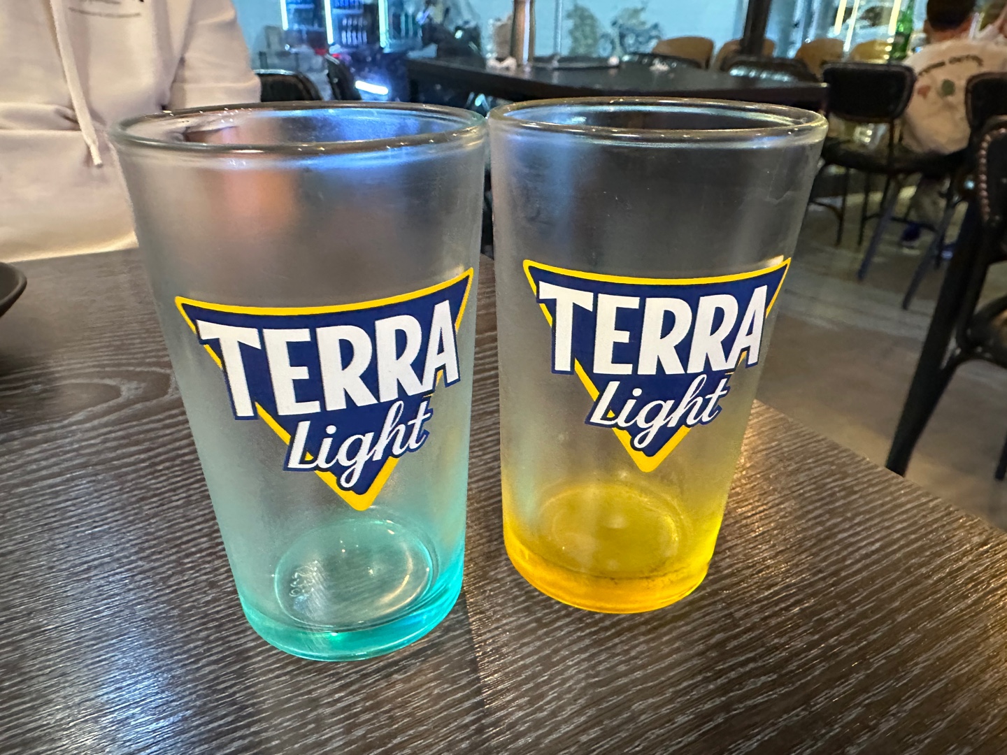 남편이 시킨 맥주잔이 정말 독특했는데요, 색이 들어간 유리잔에 시원한 거품 맥주가 담기니 보는 순간 갈증이 해소되는 기분!