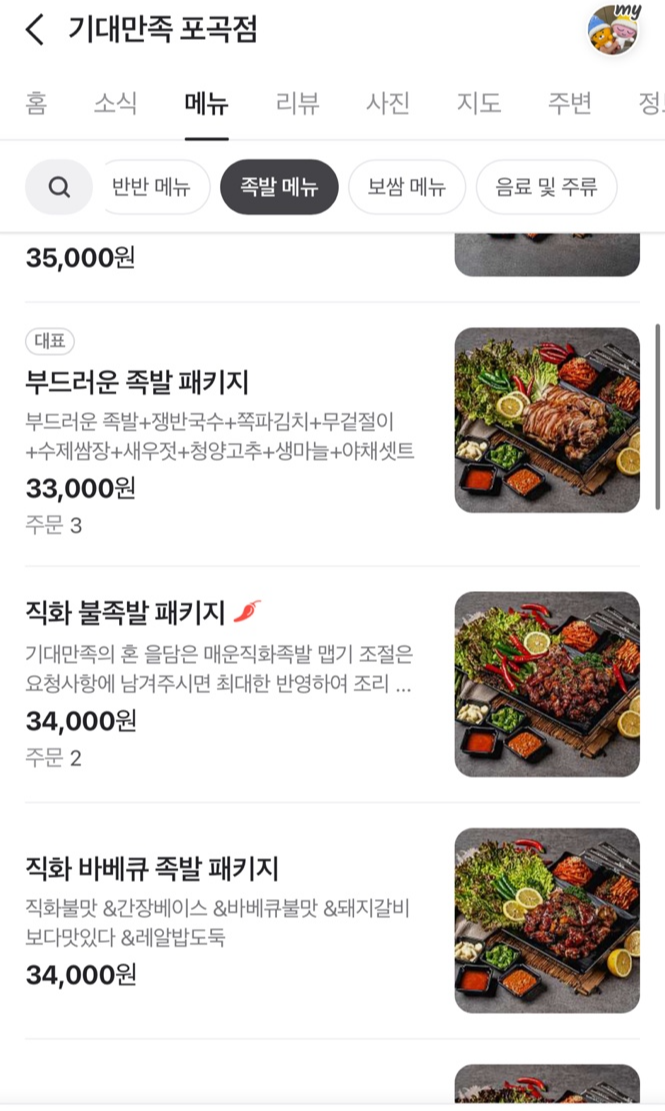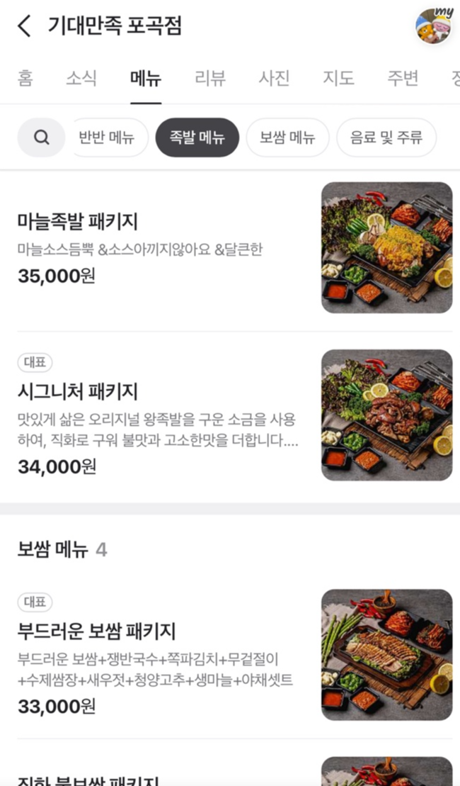 시그니처 패키지(왕족발+직화 구이): 34,000원