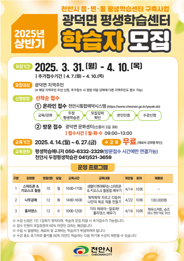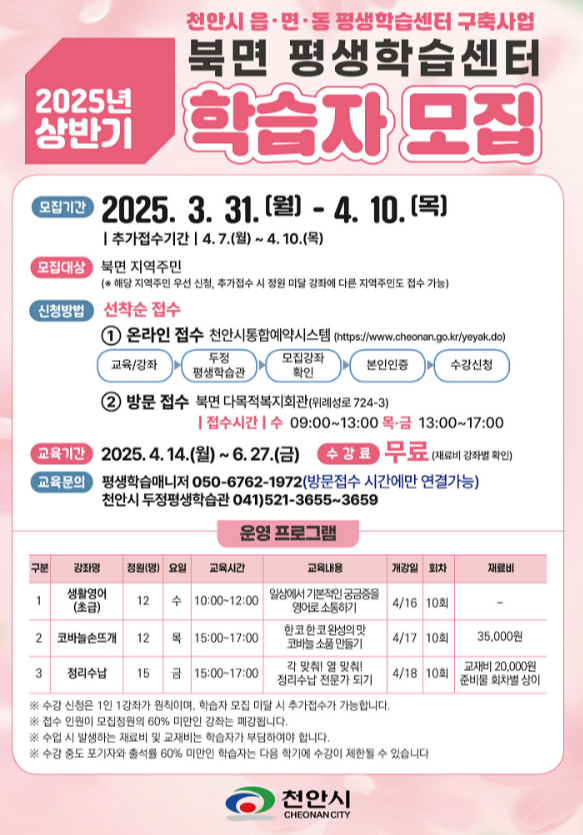 천안시는 시민들의 평생학습 기회를 확대하고, 지역별 맞춤형 교육을 제공하기 위해 (재)충청남도평생교육인재육성진흥원과 함께 2025년 상반기 읍면동 평생학습센터 프로그램을 운영합니다. 이번 프로그램은 다양한 연령층이 쉽게 접근할 수 있도록 구성되었으며, 생활에 유용한 실용 강좌부터 취미활동까지 다채로운 강좌를 제공할 예정입니다. 천안 시민 여러분의 많은 관심과 적극적인 참여 바랍니다!