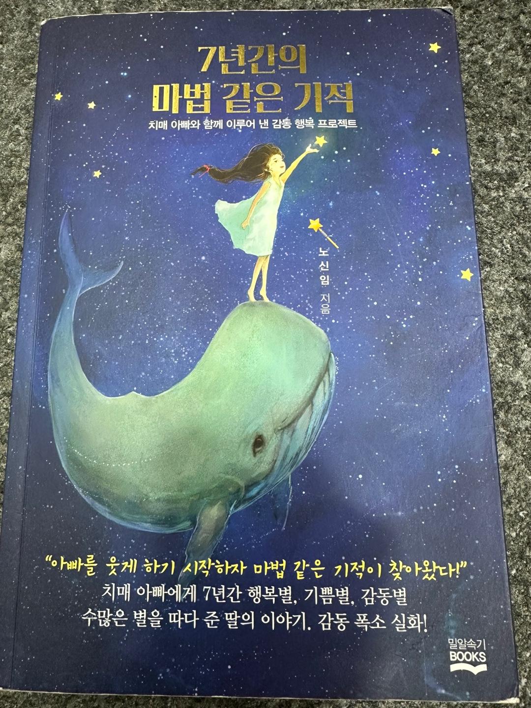 <7년간의 마법강은 기적>은 치매라는 힘든 현실에서도 사랑과 행복을 찾을 수 있음을 보여주는 책입니다. 저자는 아버지의 기억이 점점 사라져 가는 과정을 그저 슬퍼하는 것이 아니라 아버지가 행복한 순간을 더 많이 경험할 수 있도록 돕습니다. 이를 통해 우리는 가족을 사랑하는 방식에 대해 다시금 생각하게 됩니다. 또한 이 책을 읽고 난 후 부모님과 함께할 시간이 얼마나 소중 한 지 깨닫게 되었습니다. 가족이란 서로를 있는 그대로 받아들이고 사랑하는 관계라는 점을 다시 한번 마음에 새길수 있었습니다.