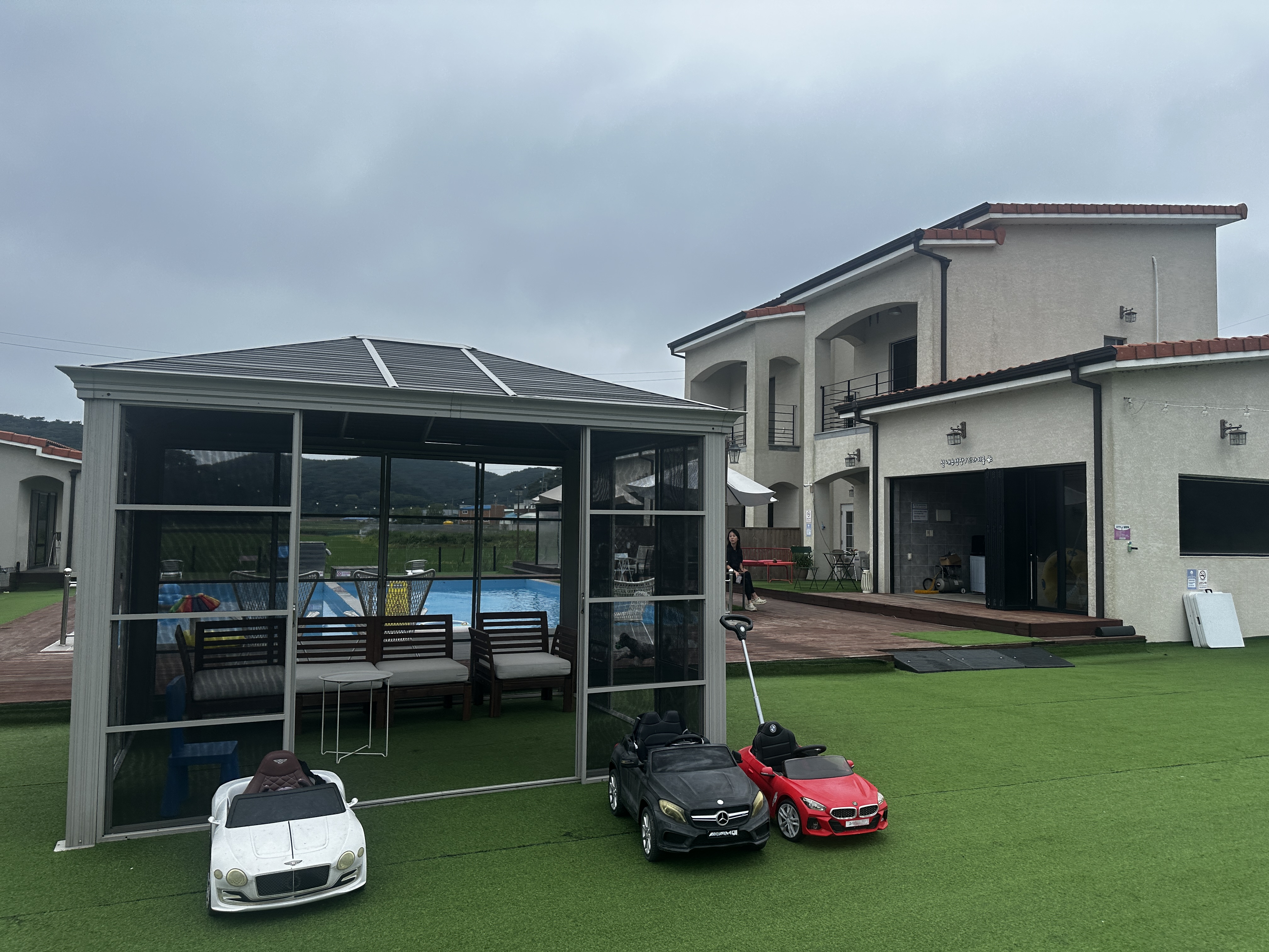 태안 골드독 펜션은 넓은 수영장이 정말 인상적이에요 숙소바로앞에 주차도 가능하고 짐 옮기기 편하도록 카트도 준비해 두셨더라고요