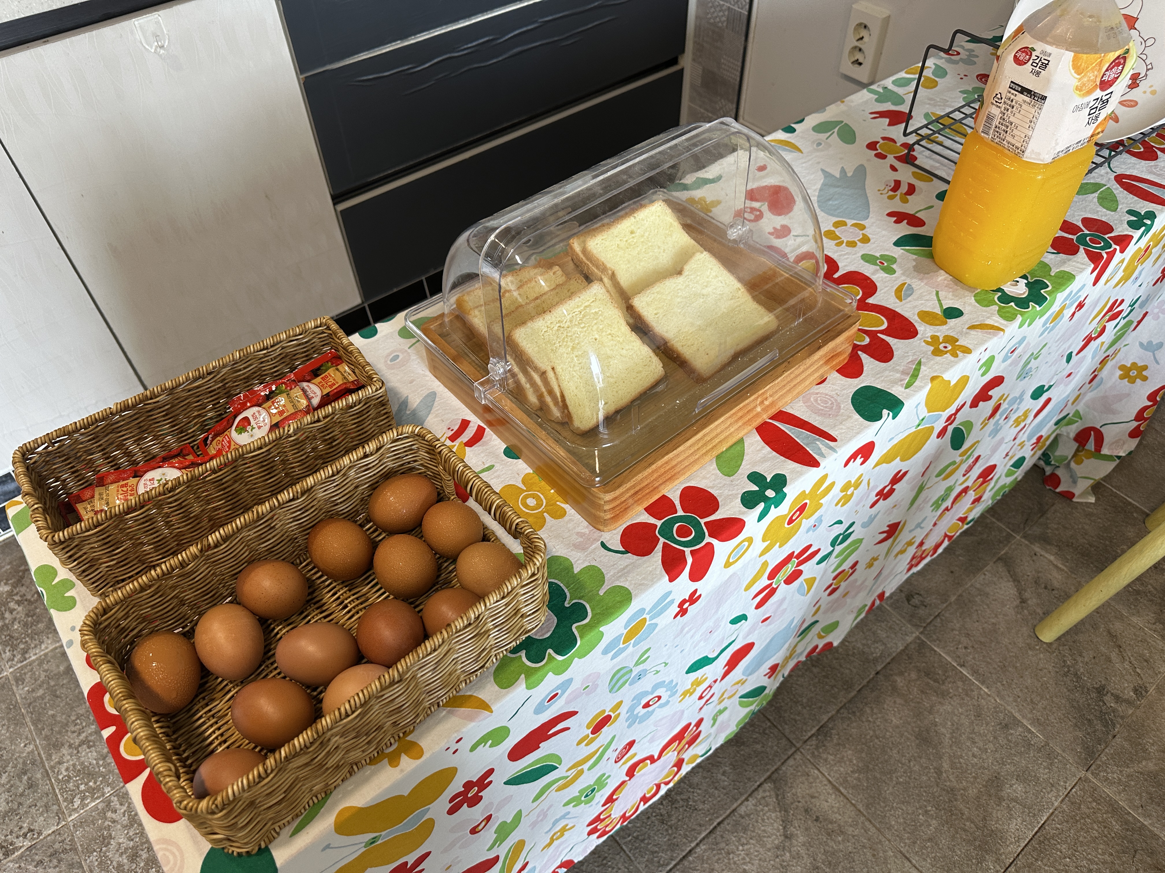 삶은달걀과 달큰한 딸기잼, 버터, 식빵, 쥬스를 제공해주셨어요