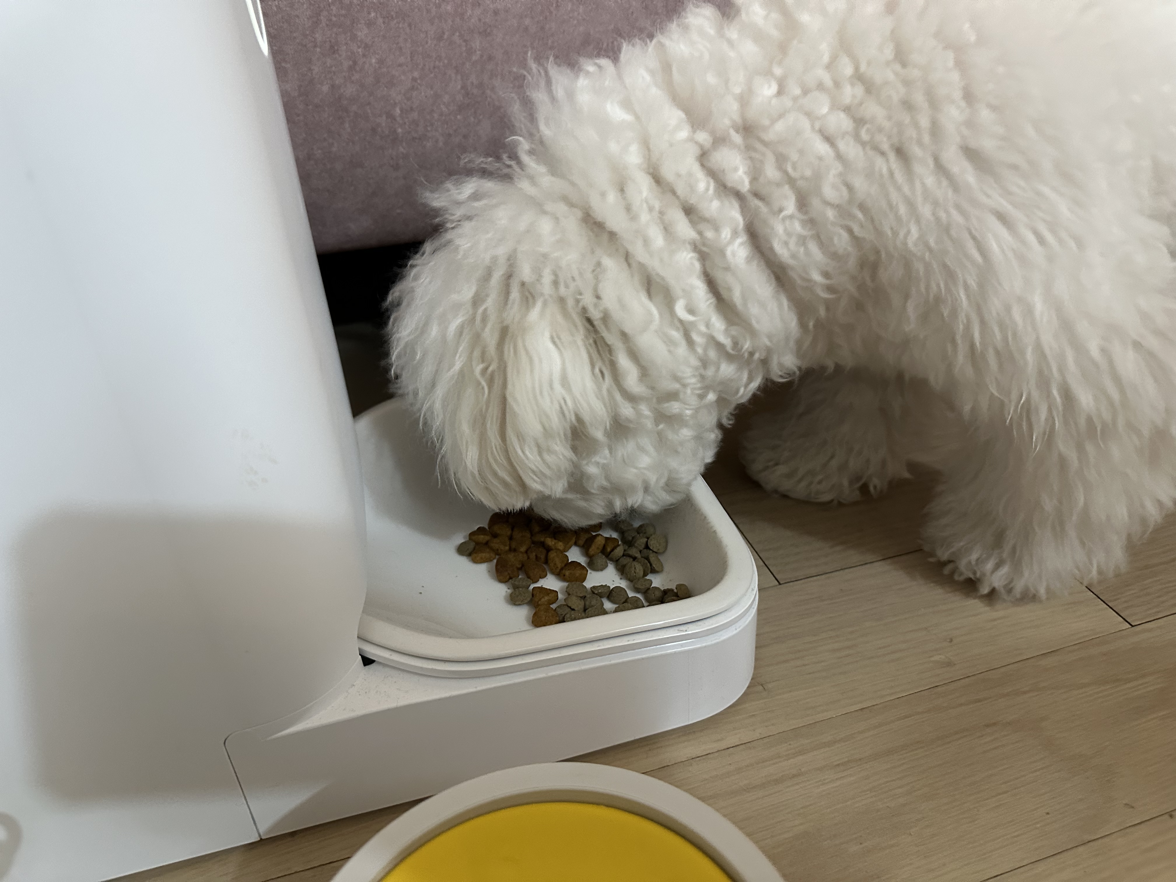 배변 활동은 기존과 큰 차이 없이 건강한 상태를 유지했으며, 특별히 설사나 변비 같은 문제도 없었습니다. 피모는 원래도 윤기 있는 편이었는데, 사료를 바꾸면서 더 나빠지거나 하는 일은 없었습니다. 그리고 가장 놀라웠던 점은, 평소 눈물 자국이 심했던 모찌의 눈에 눈물이 덜 나온다는 거예요! 항상 눈가가 축축하게 젖어 있어서 습진으로 고생했는데, 모찌의 눈가가 뽀송해진 것을 보고 정말 만족스러웠습니다. (개인차가 있을 수 있습니다.)